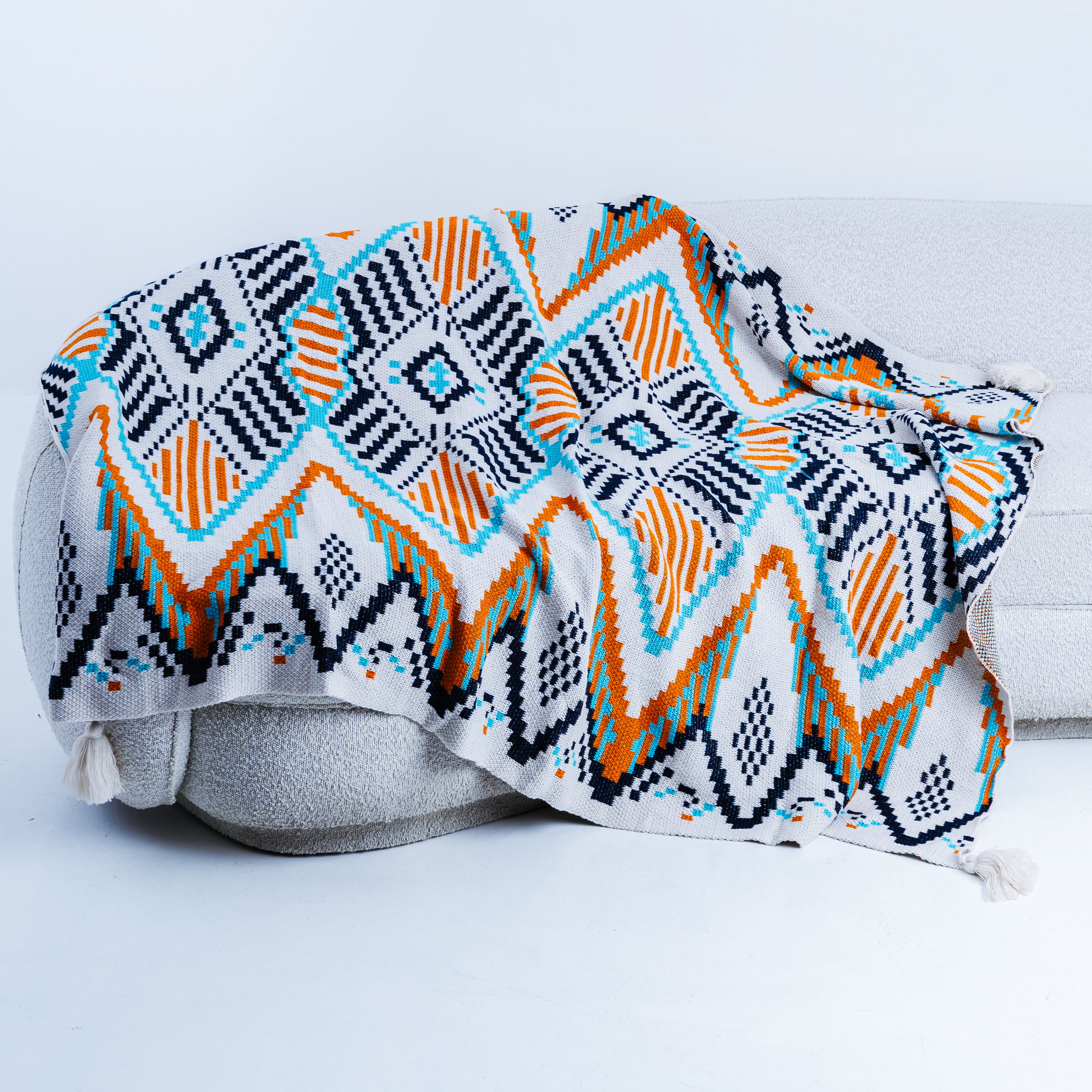 A striking geometric design that mirrors the shifting sands and vibrant hues of the desert. Warm oranges and cool blues blend effortlessly, creating an illusionary play of light and shadow—just like a distant mirage.